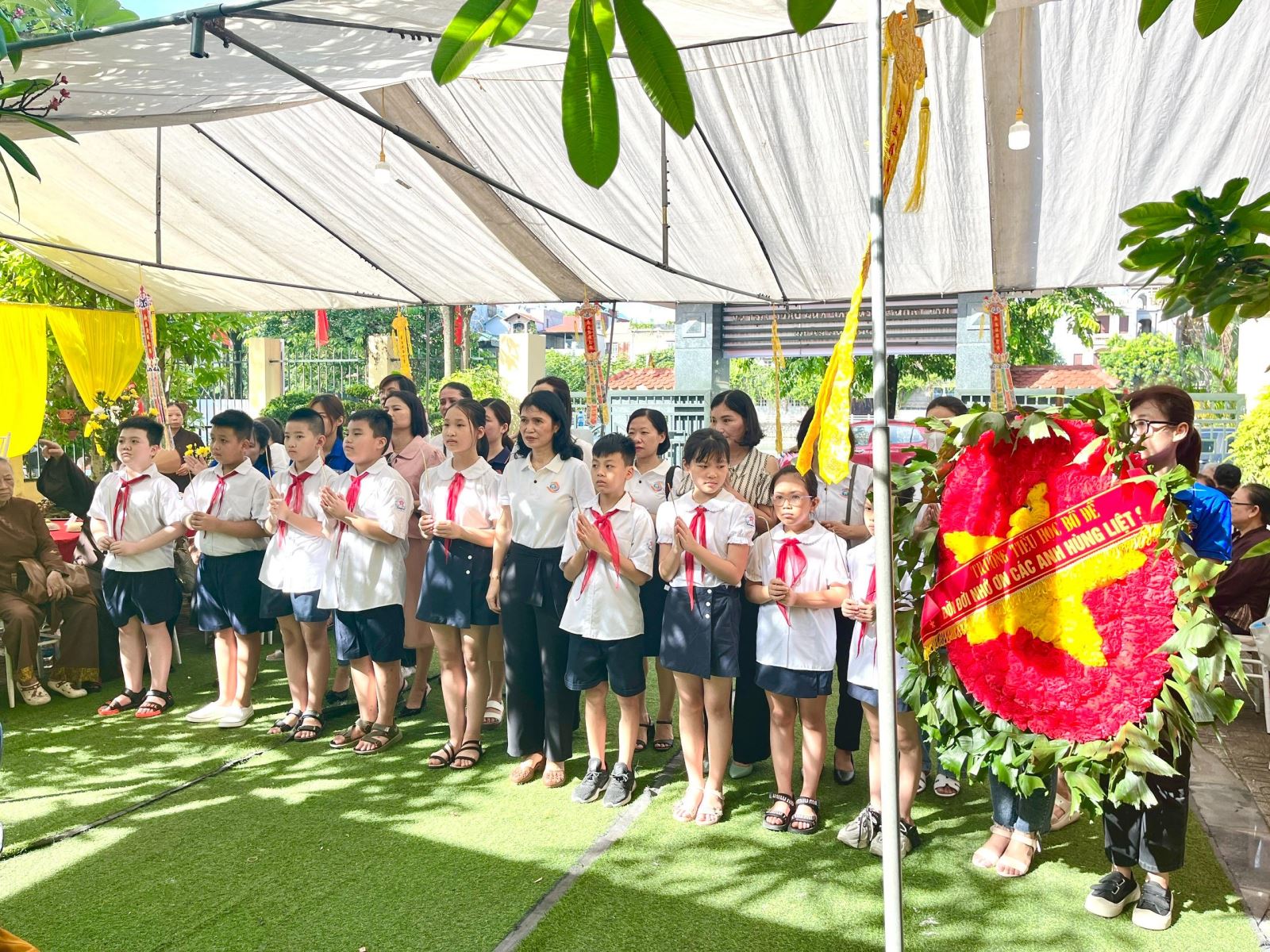 Trong không khí trang nghiêm, thành kính, trước anh linh của các anh hùng liệt sỹ, các cán bộ giáo viên, nhân viên và các em học sinh nhà trường đã kính cẩn dâng hoa, dâng hương và dành phút mặc niệm, tưởng nhớ các anh hùng liệt sĩ, bày tỏ lòng biết ơn sâu sắc đến các anh hùng liệt sĩ đã hy sinh vì sự nghiệp bảo vệ Tổ quốc; nguyện sẽ tiếp bước thế hệ cha anh đi trước, nỗ lực vượt qua mọi khó khăn, phấn đấu hoàn thành tốt các nhiệm vụ được giao, thi đua dạy tốt học tốt, góp sức xây dựng quê hương ngày càng giàu đẹp, xứng đáng với sự hy sinh anh dũng của các anh hùng, liệt sĩ. Sau phút tưởng niệm, cán bộ, giáo viên, công nhân viên và các em học sinh đã dâng hoa và thắp hương tri ân các liệt sĩ, thể hiện lòng biết ơn của mình đối với thế hệ cha anh.