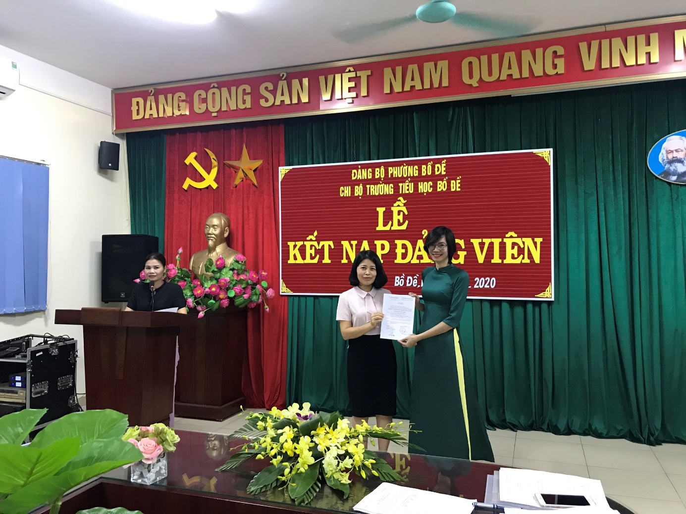 Lễ kết nạp đảng viên mới được diễn ra trong không khí trang nghiêm, đúng trình tự, thủ tục của Điều lệ Đảng, thay mặt chi ủy chi bộ trường tiểu học Bồ Đề, đồng chí Lê Thị Chung - Bí thư chi bộ đã trao Quyết định kết nạp Đảng cho đồng chí Khổng Thị Kim Dung , căn dặn đảng viên mới tích cực rèn luyện, nâng cao năng lực chuyên môn, phẩm chất chính trị, đạo đức Cách mạng, thực hiện đúng trách nhiệm và nghĩa vụ của người đảng viên Đảng Cộng sản Việt Nam.